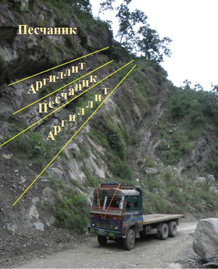 Рис. 9. Пласты пород в изученном районе в основном образованы песчаниками, но иногда встречаются слои аргиллитов. Аргиллит эродирует / размывается дождями, и в конце концов вышележащая трещиноватая порода теряет опору, соскальзывает по плоскости ослабления / разрушения и блоками падает вниз (по [3])