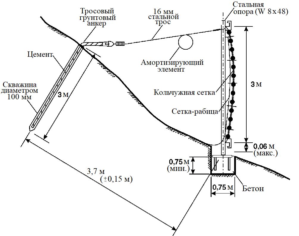Противокамнепадный барьер (камнеулавливающее ограждение) работает как гибкая барьерная система, поглощающая энергию падающих камней за счет деформирования (в идеале обратимого) его стальных компонентов (кольчужной или омега-сетки, амортизирующих элементов, тросов, шарнирных опор и других деформируемых конструкций, рассеивающих энергию) (рис. 11). Конструкция, подходящая для конкретного места, зависит от топографии, ожидаемых ударных нагрузок и высоты отскоков камней.