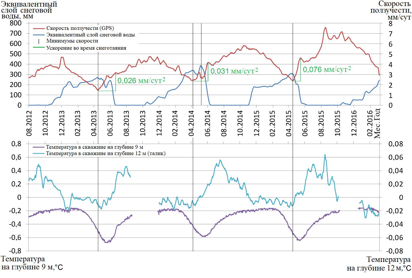 Рис. 10. Временные ряды показывают одновременное начало (вертикальные черные линии): 1 – таяния снега (синяя кривая); 2 – потепления талика, указывающего на приток воды к горизонту сдвига (бирюзово-голубая кривая); 3 – ускорения движения каменного глетчера Ритиграбен (красная кривая и зеленые пометки) в Швейцарских Альпах [3, 5]