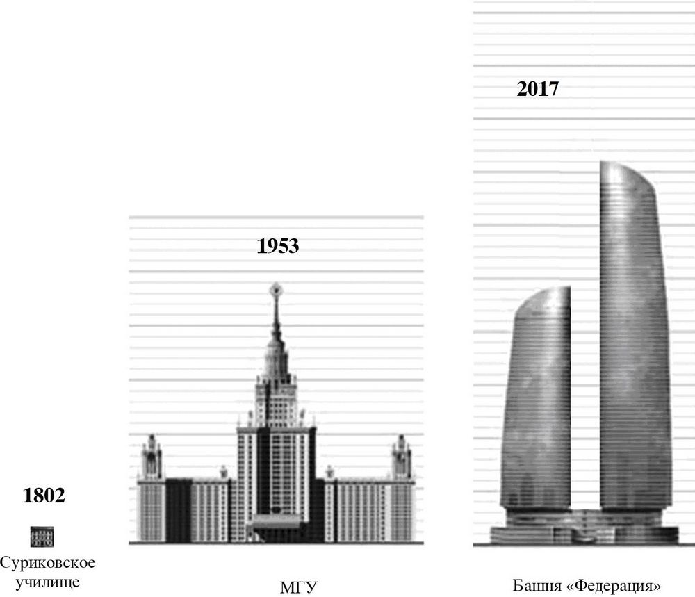 Рис. 1. Примеры увеличения этажности строений в г. Москве за последние 200 с небольшим лет [18]