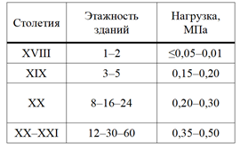 Таблица 1. Изменения этажности и статических нагрузок от веса зданий и сооружений на грунтовые основания в г. Москве (по [20])