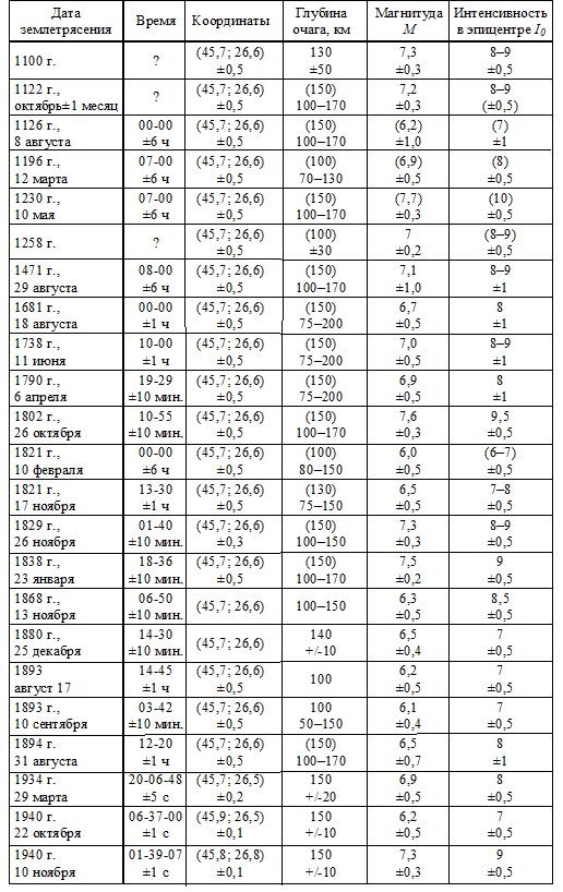 Автором была выполнена ревизия каталогов наиболее сильных глубокофокусных землетрясений в очаговой области Вранча [19] для периода с 1100 по 1650 год (табл. 2).