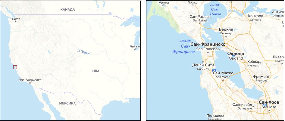 Рис. 1. Расположение региона залива Сан-Франциско на карте США при разном увеличении [15]