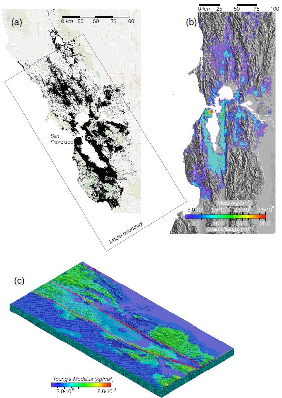 Далее Парсонс [13] выполнил численное моделирование на основе метода конечных элементов для изучения воздействия поверхностной нагрузки в регионе залива Сан-Франциско на упругое поведение самой верхней хрупкой части земной коры, используя в качестве основы подробную геологическую модель.