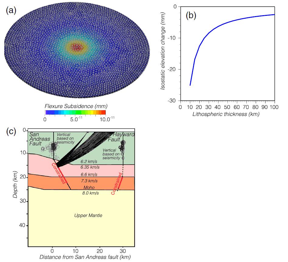 Рисунок 4. Смоделированный упругий прогиб, вызванный нагрузкой от искусственных сооружений (а); расчетные изостатические максимальные изменения высоты поверхности блока земной коры между разломами Сан-Андреас и Хейворд в результате нагрузки от городов (вертикальная ось, мм) в зависимости от толщины литосферы (горизонтальная ось, км), если допустить, что этот блок имеет полную свободу подниматься и опускаться, что маловероятно (b); сейсмические исследования методом отраженных волн, показавшие, что эти два разлома проходят через всю толщину земной коры, поэтому промежуточный блок может реагировать на изостатические силы, если он отделен от окружающих частей коры (окружности указывают на гипоцентры землетрясений) (с) [13]