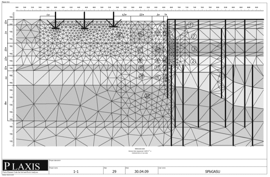 Рис. 3. Расчетная схема плоской геотехнической модели для расчета влияния разработки котлована на фундаменты соседнего здания. Цифрами указаны грунты с различными характеристиками, установленными на основе испытаний статическим зондированием по методу СРТ
