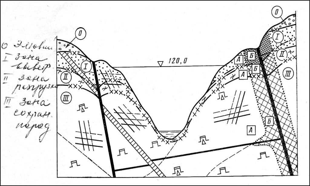 Рис. 4. Общая исходная модель строения массива диабазов, рассечённого системами разломов, тектонических трещин и трещин выветривания, определяющих блочное строение основания и зональное строения его верхней части
