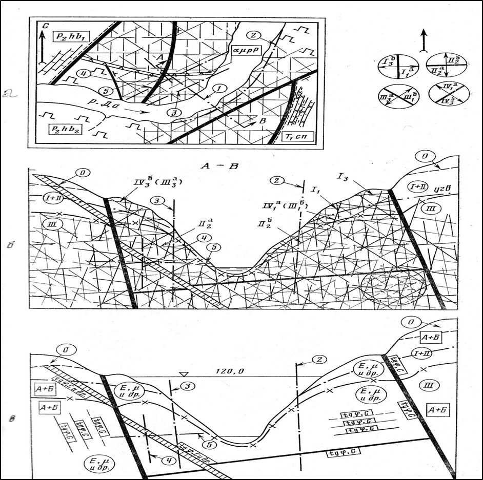 Но часто геотехники не умеют (или не хотят) правильно соотносить свои расчётные схемы и геологическую структуризацию. В настоящее время такая структуризация должна строиться на полномасштабном использовании геолого-геофизической информации о строении любого массива, когда дискретные данные, полученные геологическими методами, увязываются геофизическими наблюдениями, непрерывными по изучаемому пространству, в общую картину природного строения массива. Конечно, при этом отпадает необходимость использовать искусственное выделение инженерно-геологических элементов, поскольку можно получить реальную картину пространственного положения геологических тел, слагающих основание. И каждый раз для каждого конкретного объекта необходимо подбирать расчётную модель структуризации, отвечающую природному строению массива, установленному геолого-геофизическими методами разведки. На рисунке 4 показана общая инженерно-геологическая модель гидротехнического узла на скальном основании, предопределяющая выделение зонально-блочного строения массива и выбор направлений дальнейшей детализации структуры. Такая детализация возможна только на основе правильно подобранных геолого-геофизических методов разведки, направленных на всестороннее изучение трещиноватости (рис. 5). Без такого рода инженерно-геологических моделей, созданных геологами и принимаемых геотехниками, невозможны никакие расчёты устойчивости бетонной плотины, откосов котлована, объёмов земляных работ, обделок деривационных тоннелей и т.п. Обсуждать здесь субъективность инженерно-геологической структуризации можно разве что в плане относительности всего сущего на земле.