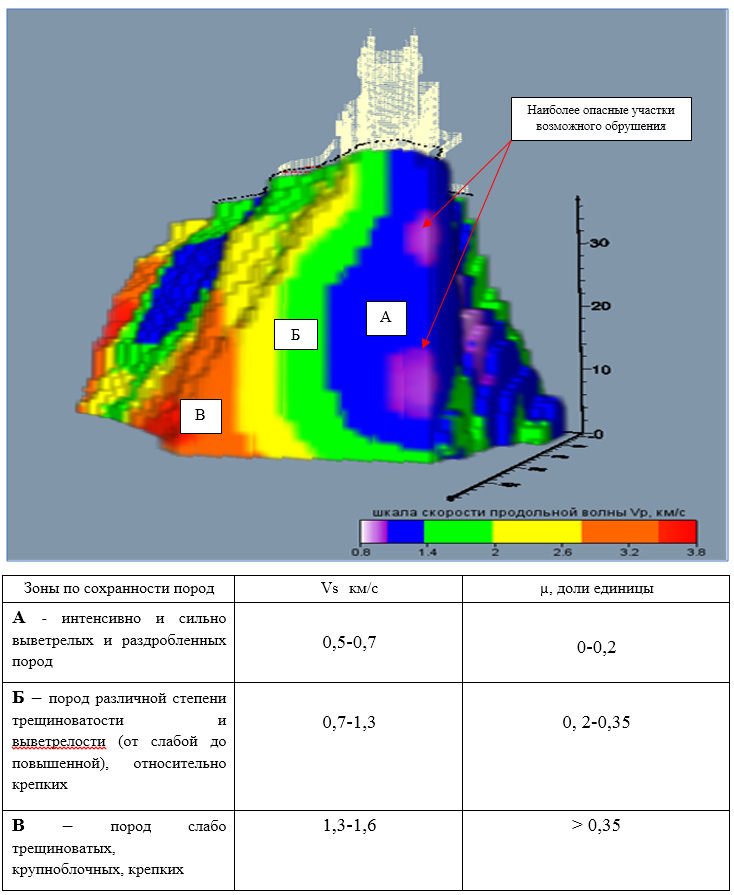 Рис. 6. Сейсмотомографическая объёмная модель, иллюстрирующая неоднородность скального массива известняков (в таблице выделенные на модели зоны охарактеризованы значениями скоростей поперечных волн и значениями коэффициента Пуассона)