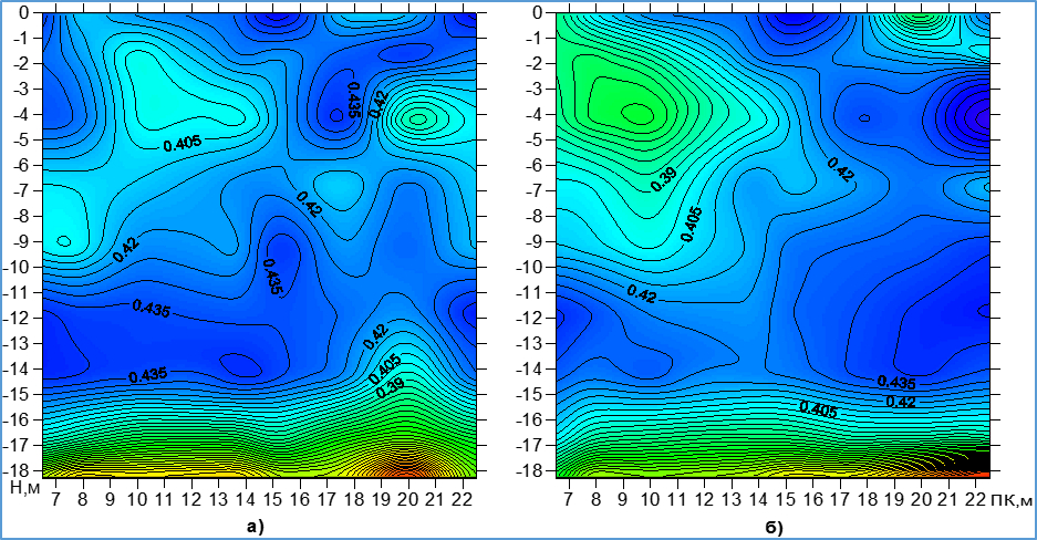 Рис. 7. Распределение значений коэффициента Пуассона по разрезу буровой скважины до (а) и после (б) внедрения стандартной железобетонной сваи на глубину 18 м от поверхности