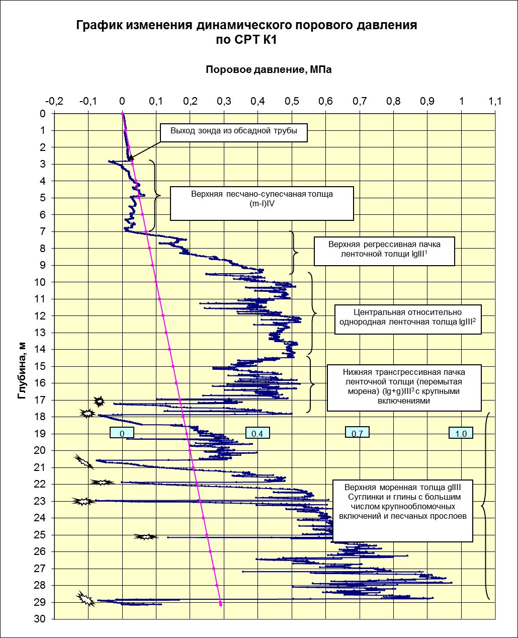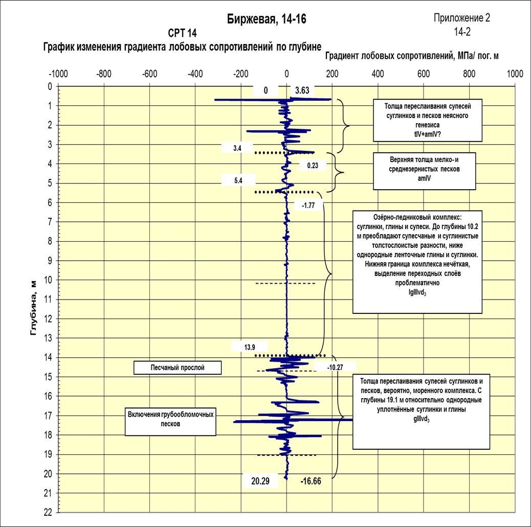 Для оснований, сложенных песчано-глинистыми грунтами, наиболее информативным методом для установления структуры массива служат различные методы зондирования, но прежде всего СРТ Cone Penetration Test, который может давать информацию о составе и свойствах грунтов по каждому сантиметру разреза, при этом знание региональных особенностей геологического разреза позволяет уверенно выделять стратиграфически обоснованные толщи, анализировать их состав, вплоть до фиксации отдельных включений грубообломочного материала (рис. 8). Графики изменения порового давления позволяют отслеживать мельчайшие нюансы литологических изменений (рис. 9). Послойная интерпретация результатов зондирования позволяет на только стратифицировать разрез, но и решать конкретные геотехнические задачи: рассчитывать несущую способность фундамента или типовых свай (согласно номенклатуре, принятой в программе Геологисмики) (рис. 10).