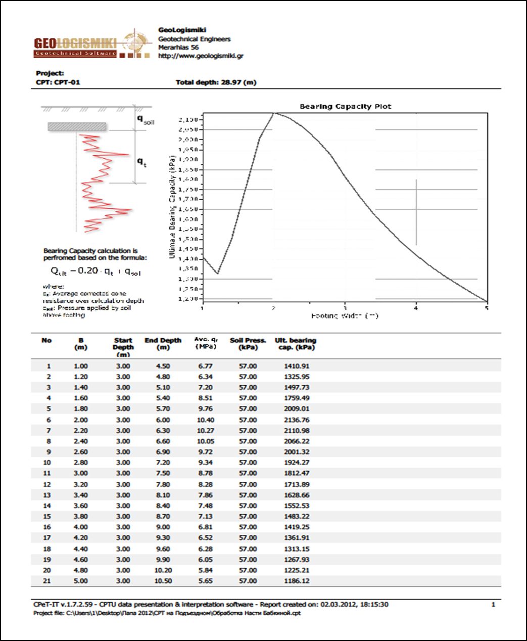 Рис.10. График изменения несущей способности ленточного фундамента по результатам СРТ в зависимости от выбранной ширины при глубине заложения 3,0 м (Программа Геологисмики)