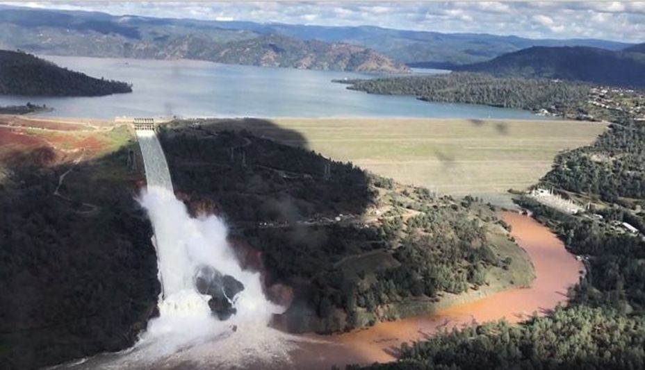 Рис. 13. Угроза порыва самой большой плотины в Калифорнии на оз. Оровилл в 2017 году. Кто же проектировал и строил этот водосброс? Можно себе представить последствия прорыва этой плотины?!