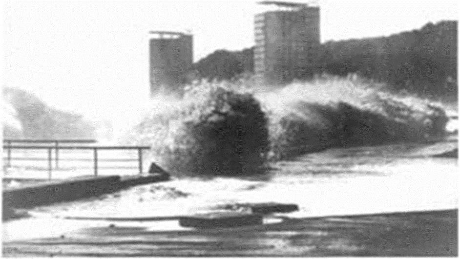 Рис. 14. Катастрофа на р. Жухе (Китай) в 1975 году. Прорыв плотин и дамб в округе Баньцао (62 дамбы). Выпало 1631 мм осадков за день! После прорыва плотины образовалась волна шириной 10 км и высотой 7 м. Суммарное число жертв более 170 тысяч человек. Китайская строительная практика часто вообще игнорирует интересы населения целых регионов, исходя из государственных интересов развития сельского хозяйства и водопользования… Благие намерения порождают дорогу в ад!
