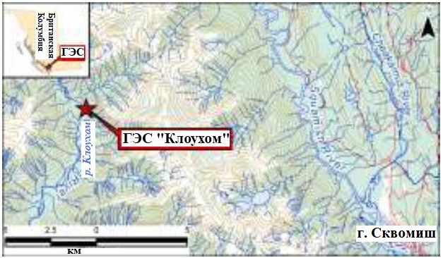 Рис. 1. Место строительства гидроэлектростанции на реке Клоухом в 27 км от города Сквомиш в провинции Британская Колумбия на западе Канады [1]