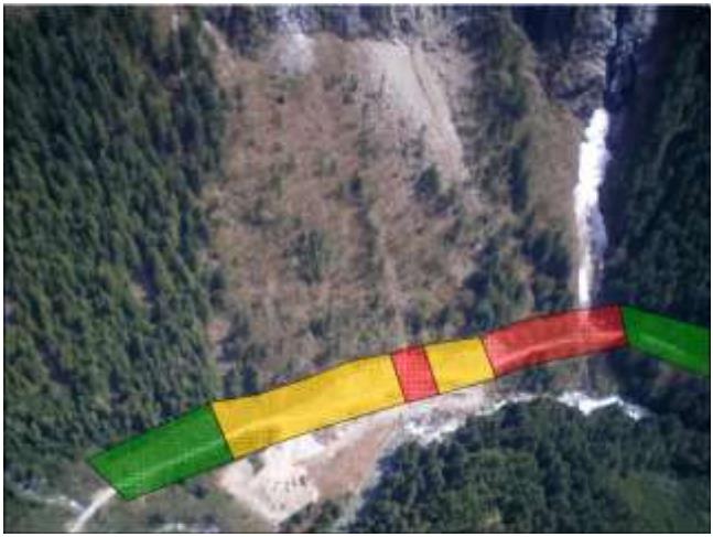 Участки низкой, средней и высокой вероятности негативных последствий от возможных камнепадов, которые могли бы быть опасными для подъездной дороги (и находящихся ниже нее объектов), а также для напорного трубопровода и работающих там людей во время почти двух лет строительства объектов ГЭС, показаны на рисунке 4 зеленым, желтым и красным цветом соответственно (на основе качественных оценок). Но в долгосрочной перспективе почти вся территория под рассматриваемым скалистым склоном может пострадать от камнепадов.