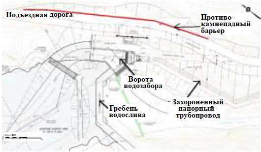 Рис. 5. План водозаборных сооружений и противокамнепадного барьера [1]
