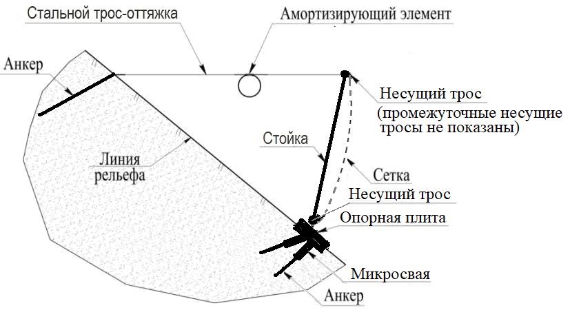 Рис. 6. Условная схема устройства предложенного противокамнепадного барьера в разрезе (промежуточные несущие тросы для сетки и боковые тросы-оттяжки для крайних стоек не показаны)