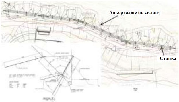 Конструкция включала по два грунтовых анкера и по две микросваи («надетых» на анкеры) в фундаментах стоек и по два троса-оттяжки, идущих от верха каждой стойки и закрепленных анкерами выше по склону (что значительно удешевило фундаменты стоек), а также по две дополнительных боковых оттяжки, идущих от верха крайних стоек и тоже закрепленных анкерами (см. рис. 6–8). Использовались преимущественно самозабуривающиеся буроинъекционные анкеры с полым стержнем (поскольку они устанавливались в очень слабых осыпных грунтах, предварительное бурение в большинстве случаев выполнять было невозможно или нецелесообразно, поэтому при монтаже анкеров бурение и цементация производились в основном одновременно или почти одновременно). Анкеры устанавливались с помощью буровой установки с выдвижной стрелой. Конечная глубина бурения варьировала. Если в конце скважины встречалась твердая порода, длина анкера уменьшалась, так как между анкером и твердым грунтом с помощью цемента могло возникнуть надежное скрепление. Для цементации через полый стержень анкера вводилась смесь цементного раствора Mircosil® Anchor Grout пополам с водой. Расчетные нагрузки для анкеров опор, анкеров боковых оттяжек и анкеров оттяжек, идущих вверх по склону, составляли 110; 170 и 202 кН соответственно. Случайным образом выбранные анкеры были тщательно протестированы на выдерживание этих нагрузок.