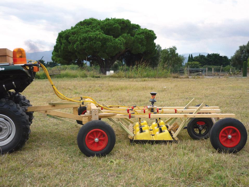 Рис. 1. Расположение трех пар одиночных антенн (закрепленных на раме, буксируемой квадроциклом), использованное при исследовании территории древнеримского города Мариана. Расстояние между средними точками антенн составляет 0,25 м. Призма электронного тахеометра установлена над центром средней антенны как можно ниже, чтобы минимизировать ошибки из-за неровностей рельефа. Датчик пройденного пути запускает георадарное сканирование через каждые 0,05 м [1]