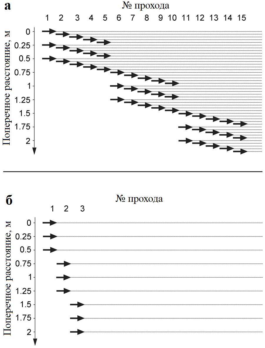 Рис. 2. Две схемы записи данных для модульной георадарной системы с поперечным расстоянием между средними точками антенн 0,25 м (для наглядности для каждого прохода показана своя отправная точка): a – для 3D-съемки в Мариане, проведенной с помощью трех пар антенн при желаемом расстоянии между соседними профилями 0,05 м (поэтому профили на таком расстоянии приходилось проходить между записанными ранее, то есть пять последовательных проходов выполнялись со сдвигом в поперечном направлении на 0,05 м, а после них следовали интервалы 0,55 м); б – для 2D-съемки с желаемым поперечным шагом между профилями 0,25 м (проходы выполнялись на поперечном расстоянии 0,75 м при использовании трех пар антенн или на расстоянии 1,5 м при использовании шести пар антенн, как в Ксантене (не показано)) [1]