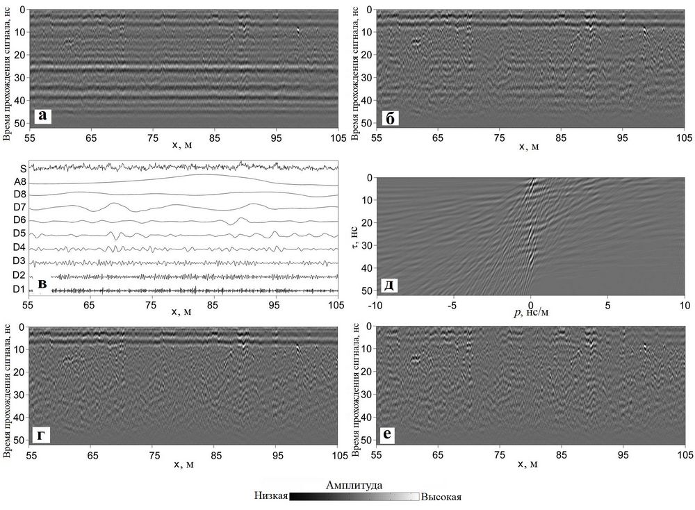 Для записей из Ксантена авторы работы [1] получили относительно хорошие результаты с помощью фильтра среднего по профилю. Сначала вдоль линий съемки (survey lines) был использован одномерный фильтр низких частот (рис. 14, б), затем в поперечном направлении — одномерный фильтр высоких частот (рис. 14, в). Наконец, изображение, содержащее только шум и помехи (isolated noise), вычиталось из исходной картины (рис. 14, г). Такая фильтрация требовала применения различных коэффициентов и оценки результата, но адекватно отделяла шум и помехи от желаемых характеристик, как показано на рисунке 8, е.