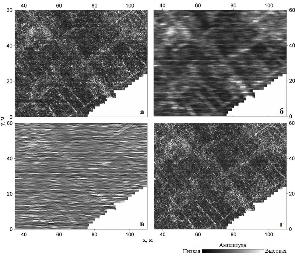На рисунке 16, а (для съемки в Мариане) показан результат моделирования шага между профилями 0,25 м путем уменьшения частоты дискретизации (decimation) данных, изначально полученных с полным разрешением (после f-k-фильтрации, как на рисунке 6, г). После этого были выполнены 2D-миграция и интерполяция на сетку 0,05 м х 0,05 м.