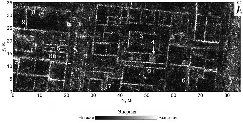Рис.15. Энергетический срез (на глубине 1,00–1,05 м) результатов всей съемки в Ксантене: a – после удаления фона путем вычитания среднего по всем трассам и 2D-миграции без полосовой фильтрации (стрелка указывает на положение профиля на рисунке 4); б – после полосовой фильтрации в частотной области (как показано на рисунке 14), преобразования во временную область, 2D-миграции и полосовой фильтрации во временной области (с использованием фильтра низких частот с окном 31 х 1 и фильтра высоких частот с окном 1 х 7) – в результате стали лучше видны древнеримские фундаменты под стены (например, № 1–3), а также недавние постройки (№ 4)