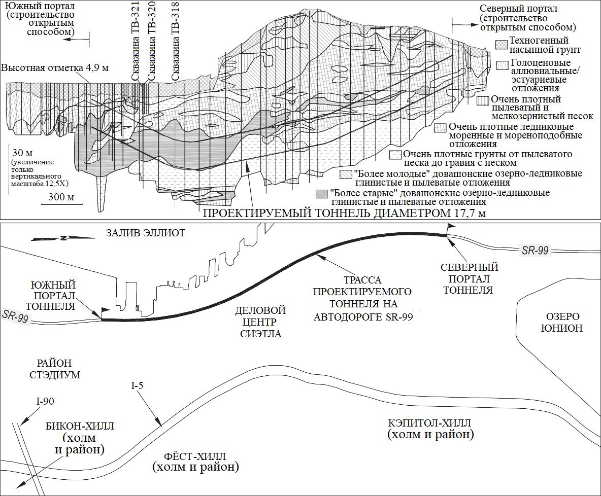 Рис. 1. Упрощенный геологический разрез и план района трассы тоннеля на автомагистрали SR-99 под деловым центром Сиэтла (по [1])