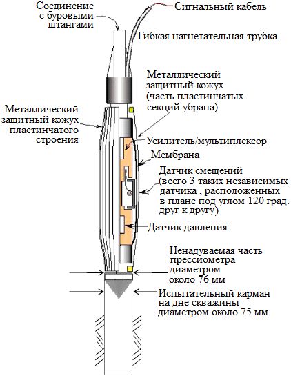 После помещения такого прибора в испытательный карман его измерительную камеру начинают накачивать газообразным азотом. Приложенное давление газа p и смещения мембраны прессиометра измеряются электронным способом с использованием датчика давления и трех датчиков смещений (размещенных в плане под углами 120 град. друг к другу). Радиальные смещения мембраны Δr, измеренные этими тремя датчиками, усредняются и пересчитываются в относительную деформацию полости ɛR (равную Δr/r0, где r0 – начальный радиус мембраны прессиометра). Результаты этих измерений передаются на поверхность земли и отображаются на экране портативного компьютера. Обычно за одно испытание получают от 100 до 800 точек данных (показания снимаются через каждые 5 секунд).