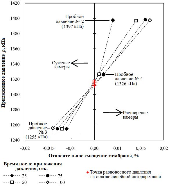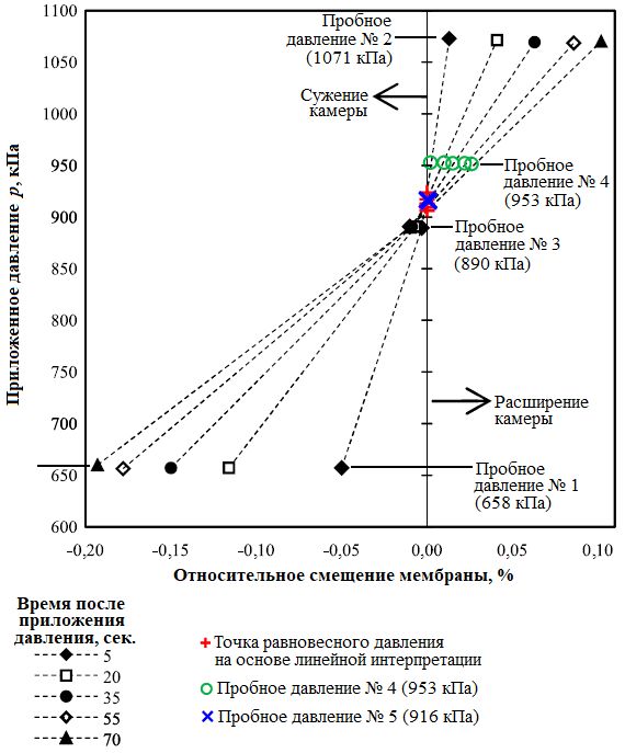 На рисунке 9 показаны результаты пяти тестов при разных давлениях в камере на стадии разгрузки во время испытания SR-99-137. Видно, что давление величиной 916 кПа (№ 5) почти не привело к смещению мембраны, поэтому оно было принято авторами статьи [1] за равновесное для отложений Qpgl на глубине проведения данного испытания.