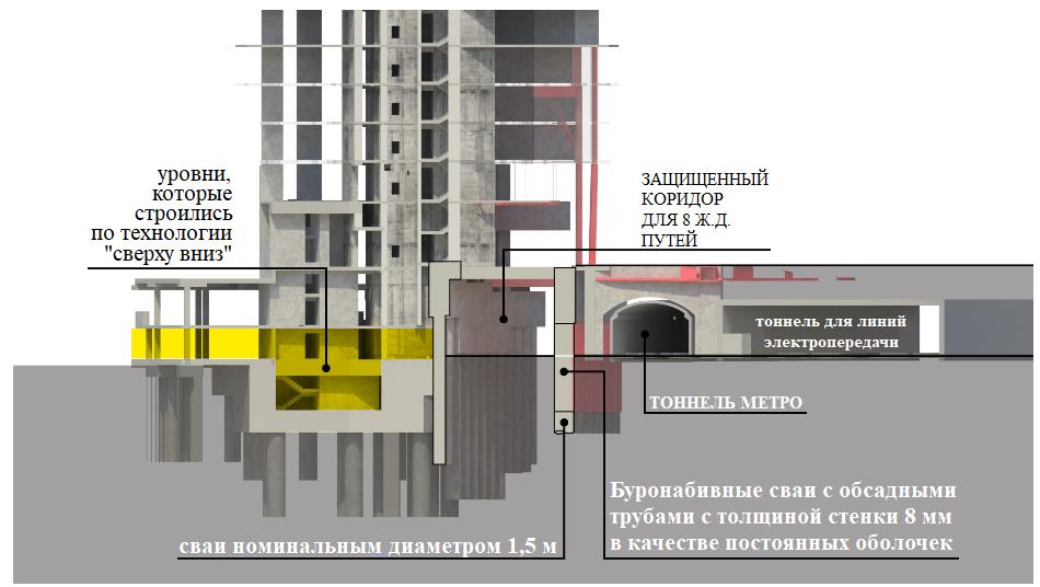 Проект предусмотрел также формирование стен защищенного коридора для восьми железнодорожных путей непосредственно под восточным крылом небоскреба с помощью свай диаметром 1,5 м (буронабивных, с оболочками из обсадных труб) и мощных ростверковых балок высотой 6 м (рис. 9). Причем сваи с восточной стороны коридора оказалось возможным безопасно устроить на расстоянии всего 50 мм от облицованного каменной кладкой тоннеля метро. Таким образом, небоскреб с восточной стороны должен был внешне стоять на земле, а железная дорога должна была быть скрыта под ним и под площадкой рядом с ним (см. рис. 9). Интересно отметить, что работа прилегающих железной дороги и метро во время строительства комплекса «Принсипал Тауэр» не прекращалась ни на минуту. Но частые вибрации от проходящих поездов и необходимость минимальных смещений грунта были полностью учтены.