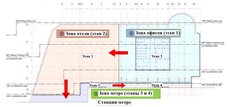 По предложению подрядчика уже на этапе строительства для создания котлована под фундамент была выбрана поэтапная выемка грунта с разделением пятна застройки на подзоны (две над станцией метро и по одной под будущими башней и отелем) (рис. 8). Это позволило лучше контролировать смещения в грунте, конструкциях и прилегающих зданиях и сооружениях, но результаты измерений могли не совпасть с первоначальными прогнозами. Поэтому команда использовала коррекцию моделей и расчетов, ранее полученных в программах gINT и PLAXIS, с помощью данных мониторинга и испытаний грунта, проводимых в процессе земляных работ и строительства. Применялось также совмещение двумерных чертежей и трехмерных моделей в PLAXIS. Все это позволило успешно реализовать проект по строительству котлована и фундамента, а также начать работы по возведению надземных частей одновременно со строительством подземных помещений.