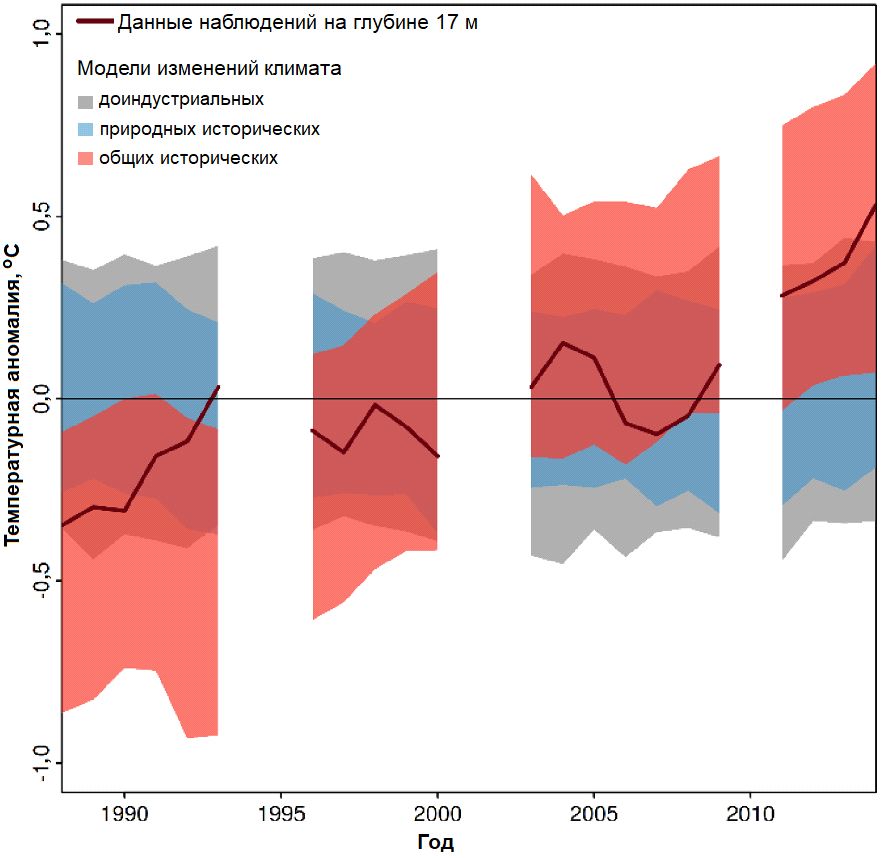 Таким образом, анализ, представленный на рисунке 3, показывает, что наблюдаемые температуры многолетней мерзлоты в рассматриваемых скважинах отражают признаки изменений климата (и не согласуются с моделями его доиндустриальных изменений), которые можно отнести к антропогенным изменениям (согласуются с моделями общих исторических изменений и не согласуются с моделями естественных исторических изменений). Дополнительный анализ, основанный на сокращенном наборе, подтвердил эти результаты.