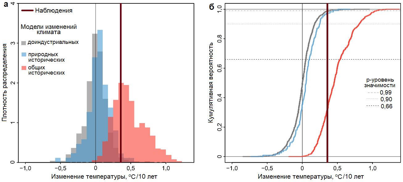 Рис. 3. Наблюдаемые и смоделированные средние тренды изменений температур многолетней мерзлоты на всех станциях наблюдений: а – гистограммы средних трендов, полученных в результате моделирования доиндустриальных, исторических природных и общих исторических изменений климата (вертикальная линия показывает глобальное среднее значение наблюдаемых трендов); б – эмпирические функции распределения трендов по рассмотренным климатическим моделям наряду с наблюдаемым средним трендом (горизонтальные линии указывают приблизительные величины p-уровня значимости, рассмотренные для данного исследования)