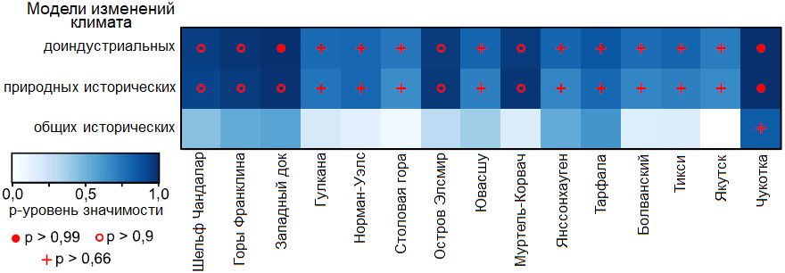 Вероятность наблюдаемого тренда с учетом результатов модельных экспериментов количественно оценивается с использованием приблизительных величин p-уровня ее значимости (p-value), применяемого для оценки достоверности результата и определяемого как доля смоделированных тенденций, которые меньше наблюдаемого тренда. Очень большие или очень маленькие значения p-уровня указывают на то, что наблюдаемая тенденция маловероятна с учетом результатов рассматриваемого модельного эксперимента. В частности, большие величины p-уровня значимости говорят о том, что наблюдаемая тенденция превышает ожидаемые тренды. Здесь следуем терминологии и понятиям, выверенным Межправительственной группой экспертов по изменениям климата (МГЭИК, англ. IPCC) [49], и используем следующие значения: p>0,66 – для обозначения вероятного выявления изменений климата, p>0,9 – весьма вероятного, p>0,99 – практически достоверного. Средние величины p (например, p≈0,5) указывают на согласованность между наблюдаемыми и смоделированными изменениями.