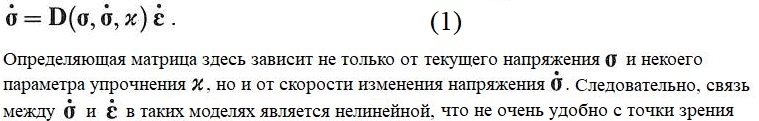 Что касается дисперсных и сцементированных зернистых грунтов и бетона, то ко времени публикации работы [8] ситуация представлялась Вермееру и Де Борсту достаточно неопределенной. Были предприняты кое-какие попытки смоделировать циклическое поведение дисперсного грунта, используя инкрементные нелинейные модели (Chambon, Darve, 1984; Robinet, Mohkam, 1982 и др.). В таких моделях инкрементальная зависимость «напряжение – деформация» имела следующую форму (напомним, что набор буквенного обозначения жирным шрифтом означает столбцовую матрицу, а точка над ним – его материальную производную по времени, то есть скорость изменения):