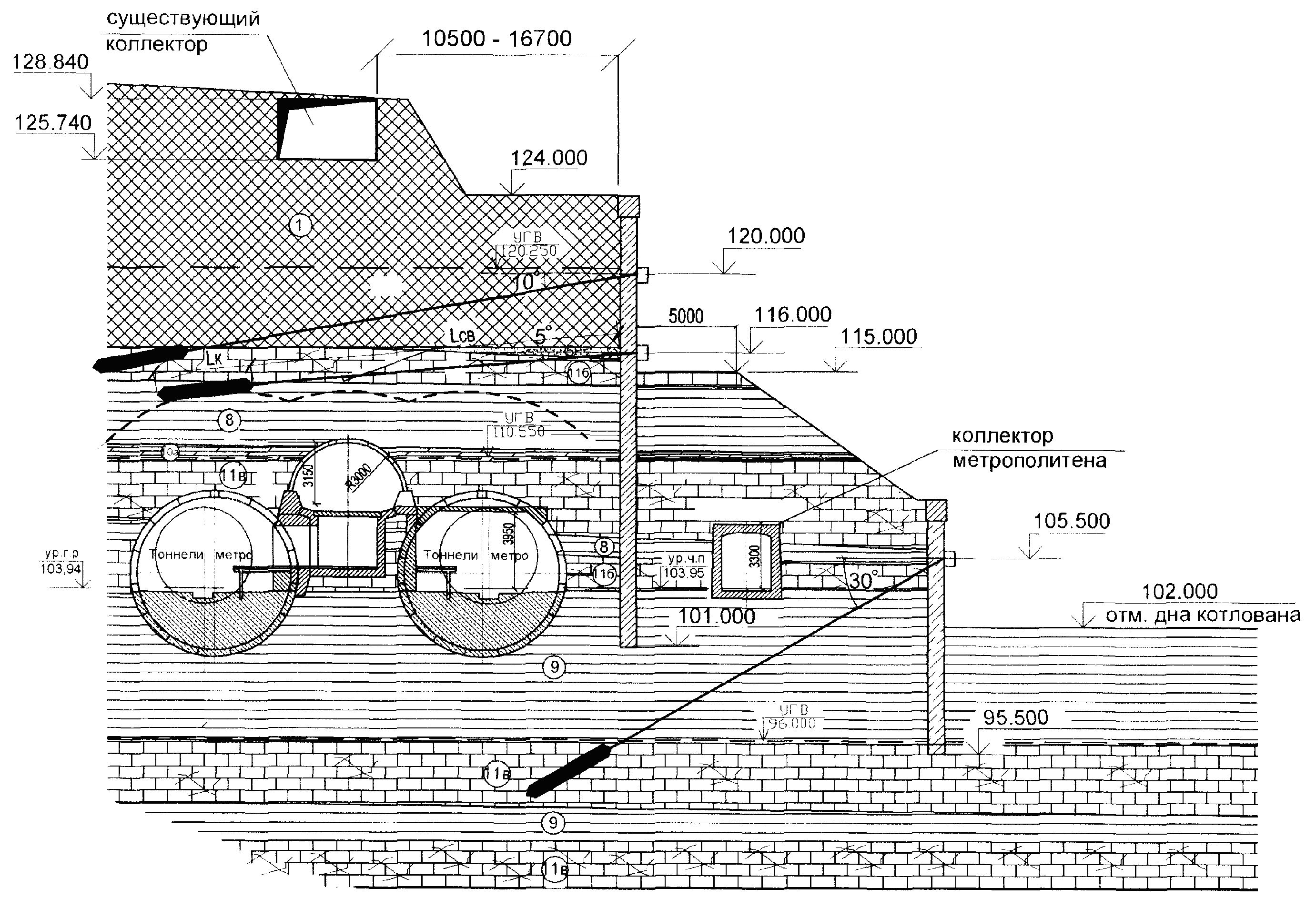 Наиболее сложными являлись участки устройства ограждений котлованов в местах прохождения линий метро и коллекторов, а также рядом с ранее выполненными ограждающими конструкциями для соседних объектов (иногда системы крепления соседних котлованов буквально накладывались друг на друга) (рис. 5). Будущие тоннели метро являлись неотъемлемой частью конструкций подземной  части одного из объектов [19].