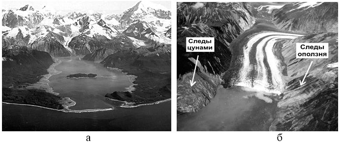 1. Óíèêàëüíûì ïðèìåðîì ÿâëÿåòñÿ êàòàñòðîôè÷åñêîå ðàçðóøåíèå äåâñòâåííîãî õâîéíîãî ëåñà è ïî÷âåííîãî ïîêðîâà 9 èþëÿ 1958 ãîäà äî âûñîòû áîëåå ïîëóêèëîìåòðà íàä óðîâíåì âîäû âîêðóã çàëèâà (ôüîðäà) Ëèòóéÿ íà þãî-âîñòîêå øòàòà Àëÿñêà (øèðèíà çàëèâà äî 3,2 êì, äëèíà 11,3 êì, ãëóáèíà äî 219 ì). Ýòî ñäåëàëà ãèãàíòñêàÿ âîëíà öóíàìè, âûçâàííàÿ âûñîêîñêîðîñòíûì îïîëçíåì. Äåëî â òîì, ÷òî 9 èþëÿ1958 ãîäà ïðîèçîøëî ñèëüíîå çåìëåòðÿñåíèå, èìåâøåå ìàãíèòóäó Ì=8,3 è ýïèöåíòð â 21 êì ê þãî-âîñòîêó îò çàëèâà Ëèòóéÿ.  ðåçóëüòàòå ñ âûñîòû îêîëî 910 ì â âîäû ôüîðäà îáðóøèëñÿ ìîùíûé îáâàë èç êàìíåé è ëüäà îáúåìîì îêîëî 30,6 ìëí êóá. ì, ÷òî ïðèâåëî ê îáðàçîâàíèþ ãèãàíòñêîé âîëíû öóíàìè âûñîòîé 524 ì ñàìîé âûñîêîé èç èçâåñòíûõ ÷åëîâå÷åñòâó (ðèñ. 1).  ðåçóëüòàòå ýòîé êàòàñòðîôû áëàãîäàðÿ íèçêîé ïëîòíîñòè íàñåëåíèÿ íà Àëÿñêå ïîãèáëî òîëüêî 5 ÷åëîâåê. Îäíàêî â ðàñïîëîæåííîì íåïîäàëåêó íàñåëåííîì ïóíêòå ßêóòàò áûëè ïîâðåæäåíû ìîñòû, äîêè, íåôòåïðîâîäû è äðóãèå îáúåêòû èíôðàñòðóêòóðû.