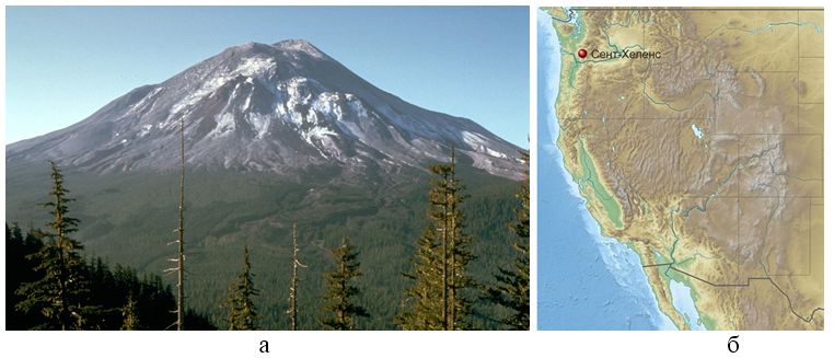 Рис. 9. Вулкан Сент-Хеленс за день до извержения в мае 1980 года (а) и его географическое положение на карте западной части США (б) [8, 17]