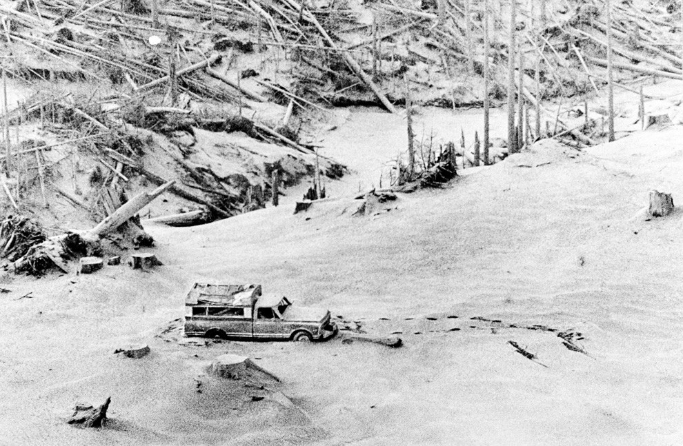 Рис. 20. Поваленный извержением лес и полузасыпанный пеплом фургон с двумя погибшими людьми, которых обнаружили спасатели через два дня после извержения примерно в 13 км от вулкана [8]