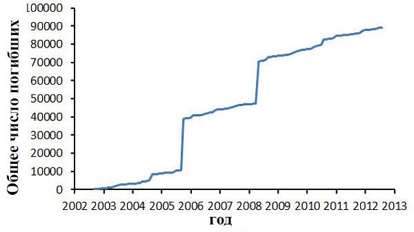 Рис. 24. Общее число погибших от опасных склоновых процессов за период с 2002 по 2013 год по всему миру на основе статистических данных, собранных британским профессором Д. Петли [22]