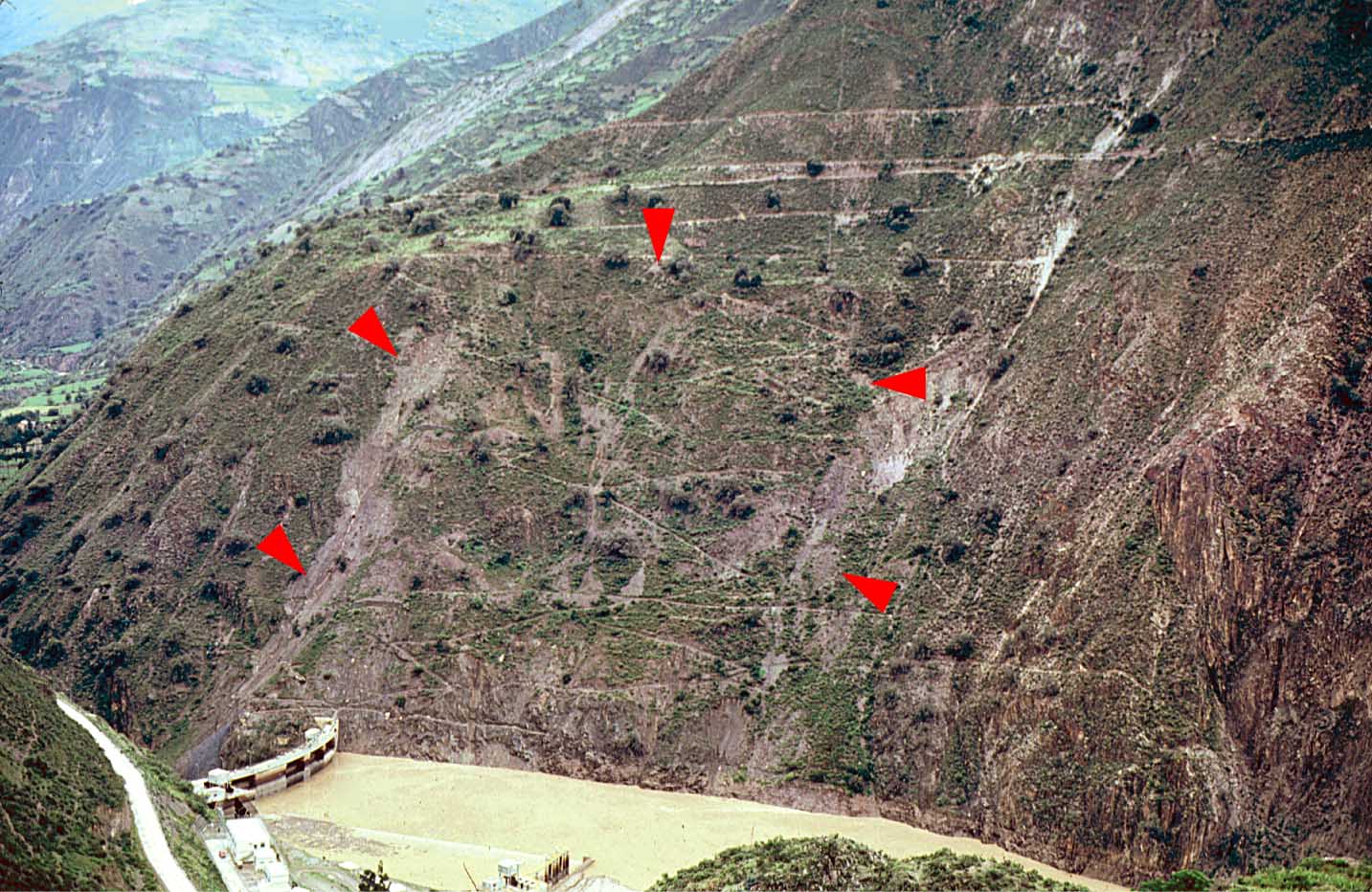 В конце 1970-х годов на юге центральной части Перу было замечено, что часть древнего оползня скальных пород в филлитах объемом 3 млн куб. м («оползня № 5») с правой стороны от 80-метровой бетонной плотины крупной электростанции Таблачака на реке Рио-Мантаро снова активизировалась (вероятно, из-за дестабилизирующего воздействия водохранилища) и стала медленно смещаться в сторону гидроэнергетического сооружения (рис. 4). В 1980-е годы перуанское правительство потратило около 71 млн долларов (в ценах 2019 года) на успешные меры по устранению угрозы от этого оползня, в том числе соорудив земляной контрфорс объемом 460 тыс. куб. м у подножия склона, горизонтальные дрены и дренажные штольни для поверхностного и подповерхностного дренажа и предварительно напряженные грунтовые анкеры [32].