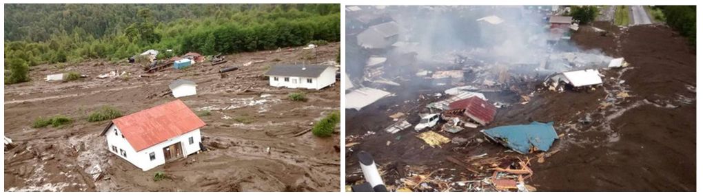 16 декабря 2017 года после проливного дождя, длившегося целые сутки, сошел оползень, перешедший в сель, в коммуне Чайтен чилийского региона Лос Лагос (в 1100 км к югу от Сантьяго). Пострадала деревня Вилла Санта Люсия, в которой погибло до 20 человек. Большое количество жилых домов и местная школа получили повреждения или были уничтожены (рис. 7). Были разрушены также системы электро- и водоснабжения. Десятки людей были эвакуированы в соседний город Чаитен [13, 14].