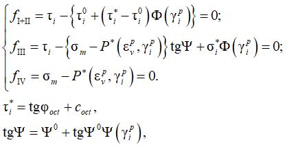 где γip – интенсивность пластической деформации сдвига; εvp – пластическая объемная деформация; σm – среднее напряжение (нормальное октаэдрическое); τi, τi* — интенсивность касательных напряжений и ее предельное значение соответственно; φoct, coct – октаэдрические параметры прочности; Φ, Ψ, P – функции упрочнения.