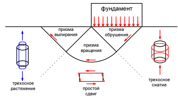 Рис. 1. Условное разделение грунтового основания в предельном состоянии на зоны по видам напряженного состояния