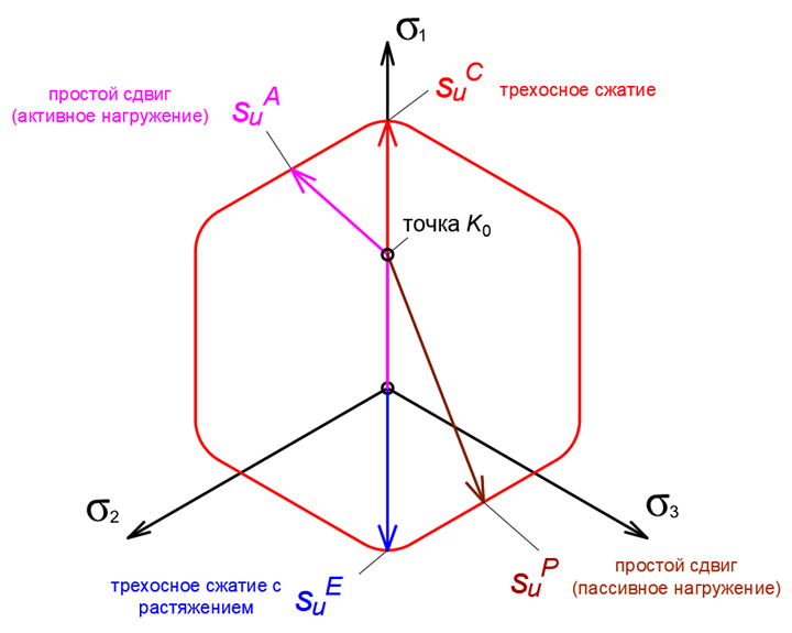 В основе модели лежит условие прочности Треска, представляющее собой правильную шестиугольную призму, ось которой совпадает с гидростатической осью. Для учета физической анизотропии ось призмы смещается по одной из координат (как это происходило бы при кинематическом упрочнении). Фактический размер и положение поверхности прочности определяются по значениям сопротивления недренированному сдвигу при различных траекториях нагружения: при трехосном сжатии TXCsuC; при трехосном растяжении TXEsuE; при активном нагружении в условиях плоской деформации PSAsuA; и при пассивном нагружении в условиях плоской деформации PSAsuP. В результате поверхность прочности оказывается смещенной относительно гидростатической оси (рис. 2).