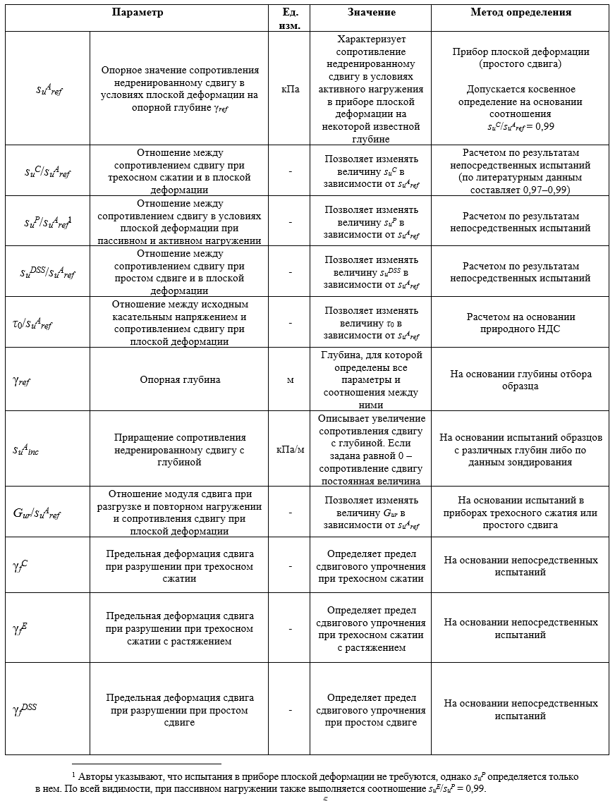 Все параметры модели вводятся не в абсолютных величинах, а как отношение к величине сопротивления недренированному сдвигу при активном нагружении в условиях плоской деформации suA, которая, в свою очередь, может быть задана как функция глубины отбора (известно, что сопротивление недренированному сдвигу с глубиной возрастает). Таким образом, модель может использоваться для воспроизведения поведения элементов достаточно большой мощности без необходимости разделять толщу на отдельные РГЭ.