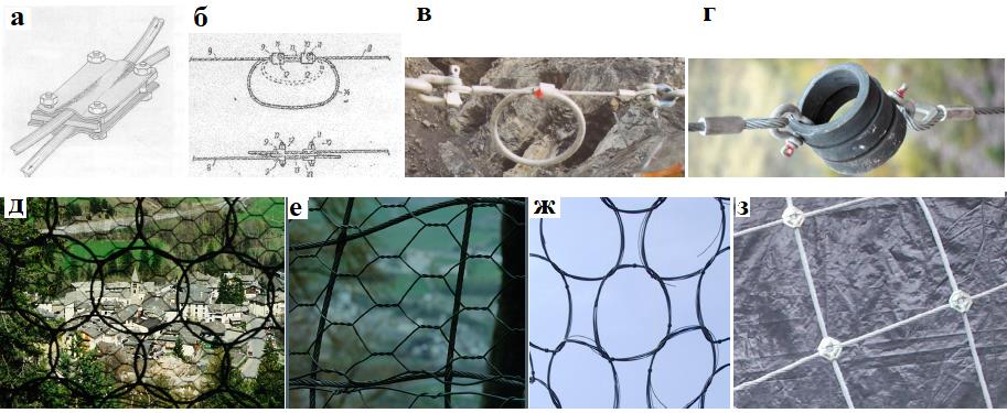 Рис. 18. Некоторые распространенные типы тормозных элементов гибкого противокамнепадного барьера, работающих за счет: а – трения натянутого троса между фрикционными пластинами; б – трения между зажимами троса; в – уменьшения диаметра петли из гибкой стальной трубки; г – удлинения спиральной конструкции. Типы сеток гибких противокамнепадных барьеров: д – двойная система из кольчужной сетки с крупными круглыми ячейками и сетки двойного кручения с более мелкими шестиугольными ячейками; е – двойная система из сетки с крупными ячейками из сращенных тросов и сетки двойного кручения с более мелкими шестиугольными ячейками; ж – еще одна разновидность кольчужной сетки; з – сетка из тросов, скрепленных зажимами