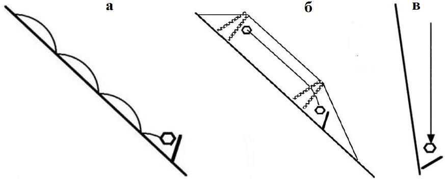 Рис. 20. Различные методы испытаний гибких систем защиты от камнепадов: а – свободная траектория железобетонного снаряда с ударом, включающим также вращение, при неопределенном месте столкновения; б – наклонная траектория вдоль направляющего троса с определенным местом удара; в – вертикальное падение вдоль направляющего троса с определенным местом удара